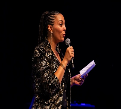 Belgo-congolaise, Julie Lombé est slameuse depuis 2015. Elle est membre du collectif de poétesses L-Slam créé à Liège, ville où elle vit. Elle remporte le prix littéraire Paroles Urbaines en 2019, est finaliste du Championnat Européen de Slam en 2020 en Slovénie, du Festival International de Slam Poésie d’Acadie en 2021 et des Joutes poétiques de Granville en 2023. Elle animera des ateliers et présentera sa performance solo SPA, une poésie-soin immersive qui mêle slam et réflexion sur le care, la santé, le stress et les discriminations raciales ou de genre.
